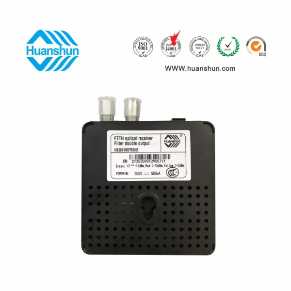 環順的HSGS10076D/2光接收機是專為CATV網絡的FTTH 應用而設計的入戶型光接收機。具有結構小巧緊湊、式樣美觀、 應用方便等 特點,在高達1000Mhz的帶寬下能夠提供穩定的輸出電平和優異的性能指標,具有極寬的光功率工作范圍。