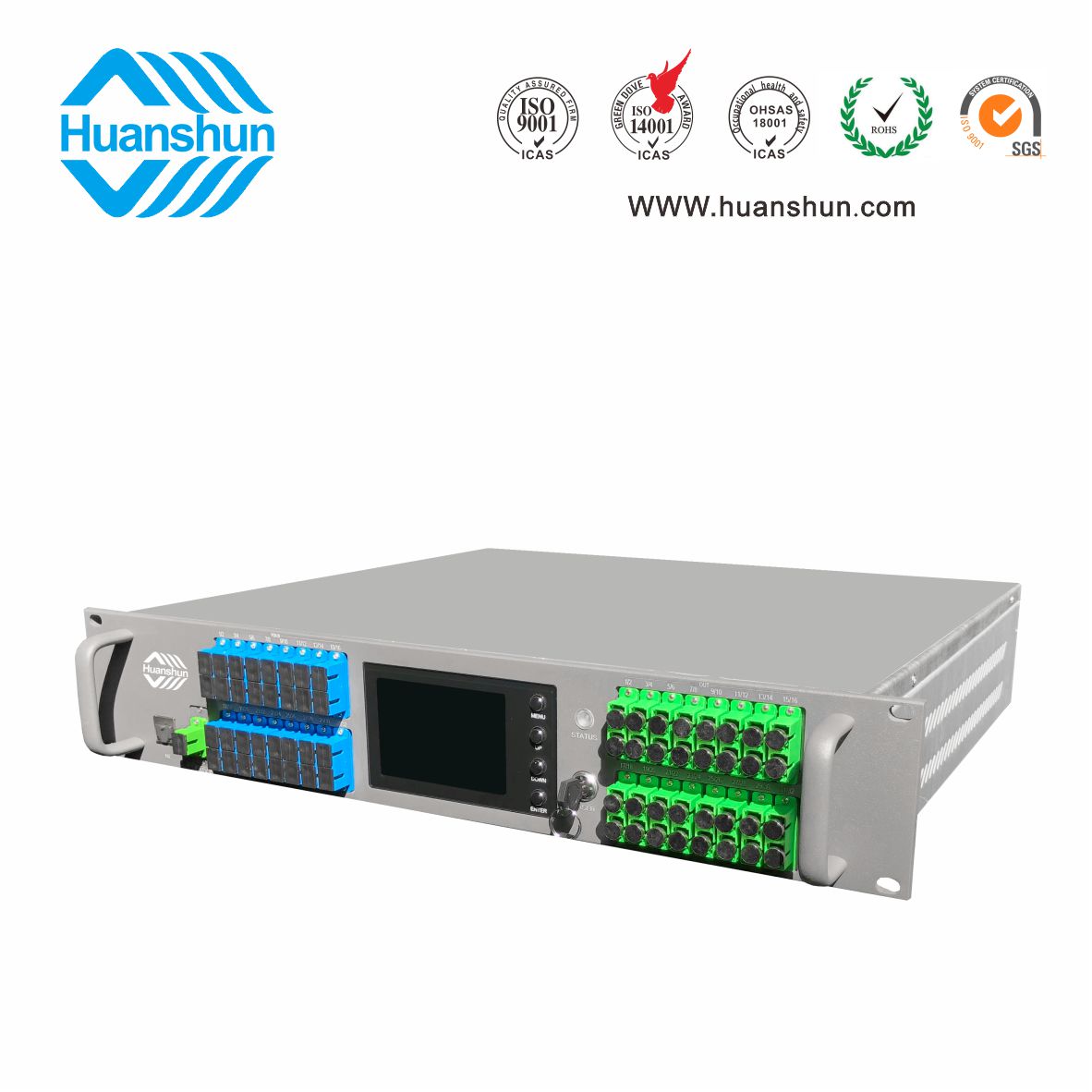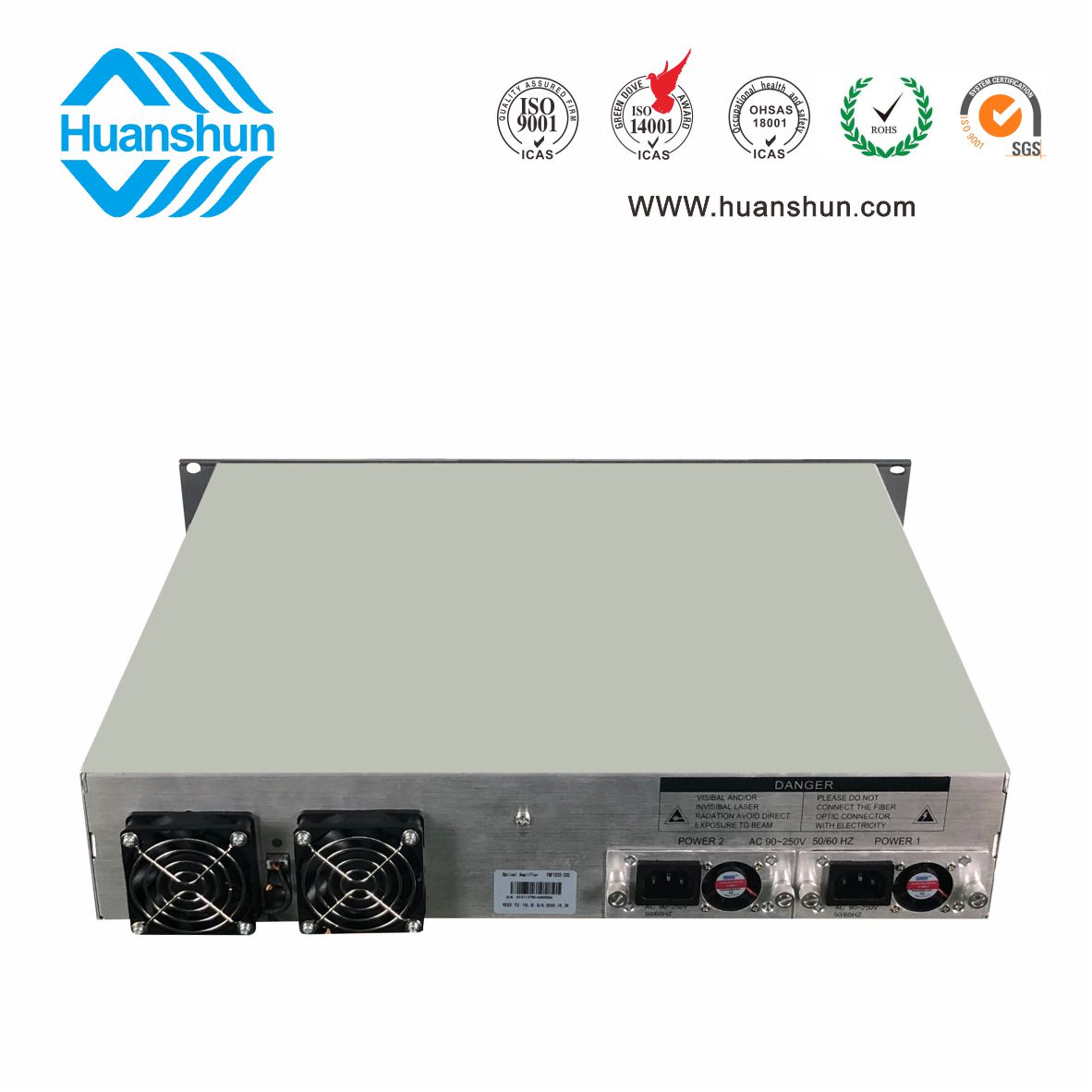 19 " 2U/3U標準機箱,-5 ~ +10 d Bm輸入,32路標稱規格(16、17、18、19、20、21、22、23dBm)放大輸出,并支持下調-2dB,安全連接模式,NF ≤ 5dB(0dBm時);內置FWDM合波器,插播損耗 ≤ 1dB;雙模塊熱插撥電源,AC90 ~ 255V或DC-48V供電,RJ45標準網管(支持SNMP、WEB)